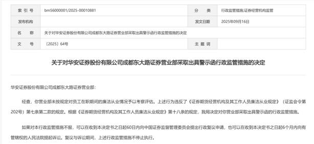 最近,Huaan证券(600909.SH)因监管机构违反其业务部门而被罚款两项监管机构。四川证券法规宣布的行政监管措施表明,蒂安·凯(Tian Ke)是成都dongda dongda dongda dongda de huaan证券的Brucan人员的成员,向客户介绍了虚假的金融产品,寻求不适当的利润,并向客户造成了重大损失。蒂安·凯(Tian Ke)受到校长的监督,要求采取有序的行政和监督措施以纠正情况。另一项管理和监督措施表明,成都东达的道路价值观无法检查和评估必要时使用的雇员的清洁和就业N证券监管局已决定采取行政和监督措施。记者无法在价值专业人士的信息系统中咨询天凯的信息。此前,安海证券监管局今年3月3日揭示了“罚款”,表明,惠扬证券研究所负责人Yanji无法有效地规范该研究所个体员工的专业行为。因此,Yin Yanji采取了监督和控制措施发出警告信。 Huaan证券为2025年的半年度报告显示,它的运营收益为28.8亿元人民币,与上一年相比增加了43.09%。股东归因于股东的净收入为10035亿元人民币,比上一年增加了44.94%。在今年上半年,业务经纪经纪的收入为7.65亿元,比上一年增加了62.76%。它是自己的商业收入是7.65亿元人民币,比上一年增加了77.0%。商业投资收入为1.11亿元,比上一年增加了214.5%。商业资产管理为3亿元人民币,年龄增长10.1%。价值和金融业务的收入为3.13亿元人民币,一年增长了6.4%。在2025年第一学期结束时,该公司的总资产为1002.1118亿元人民币;净资产为231.1亿元人民币,母公司的净资本为184.69亿元人民币,净资产的加权平均绩效为4.52%。天凯推荐虚假的金融产品。客户损失了多少?校正措施是什么?在一个相关的问题中,记者向Huaan Securities发送了一封访谈信,但从报告时开始就没有答案。